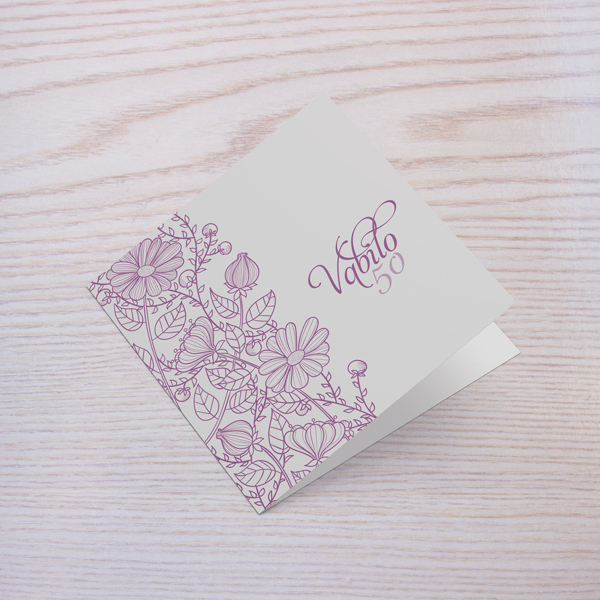 Vabilo z dodatkom bordure iz cvetov v vijolični barvi.Poljubno lahko prilagodite tekst na naslovnici in v notranjosti vabila.Vabilo 14x14cm - 1x zgibano