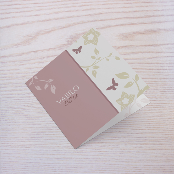 Vabilo z vzorcem metulja, cvetlic v rjavi, beli in roza barvi.Poljubno lahko prilagodite tekst.Vabilo 14x14cm, 1x zgibano.